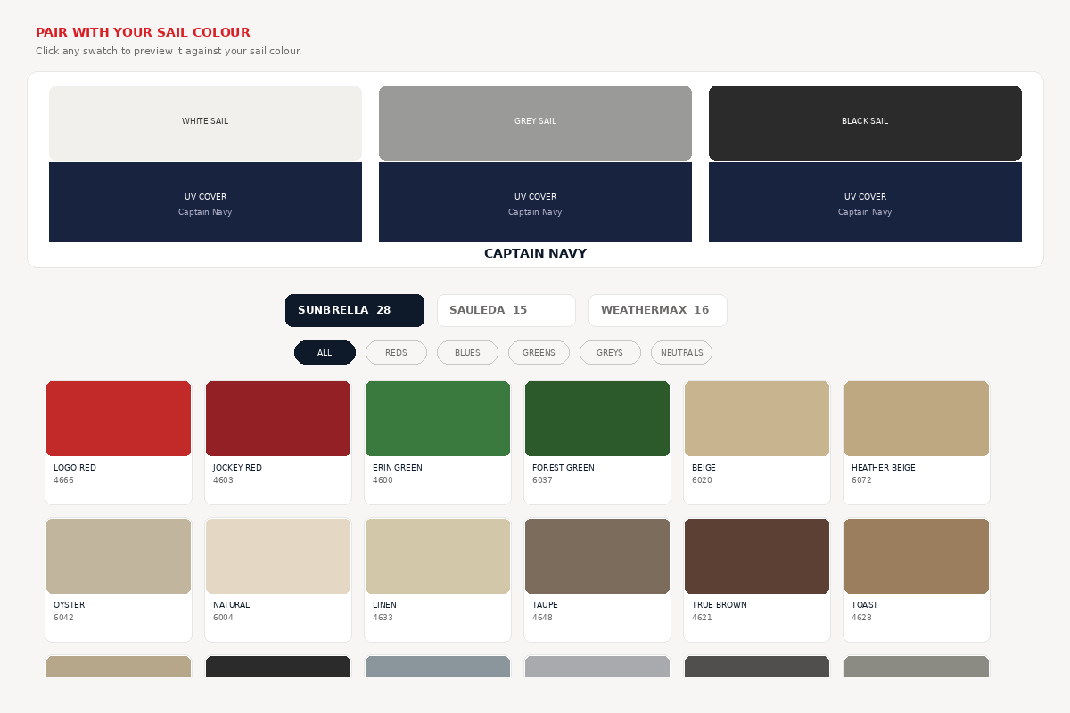Browse our full range of Sunbrella, Sauleda, and WeatherMAX UV fabrics. Preview any colour against white, grey, or black sails with our interactive colour picker.